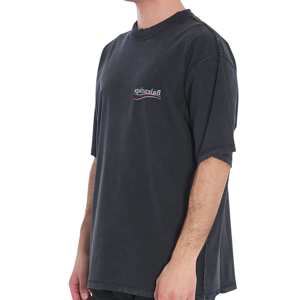 טי־שירט אוברסייז בגוון שחור מבית Balenciaga, בעיצוב מינימליסטי שמכוון ישירות לאוהבי האסתטיקה הנקייה והיוקרתית של המותג.